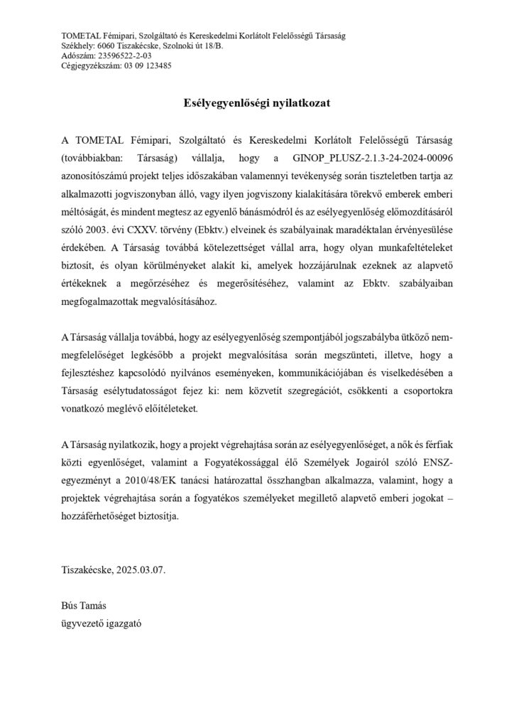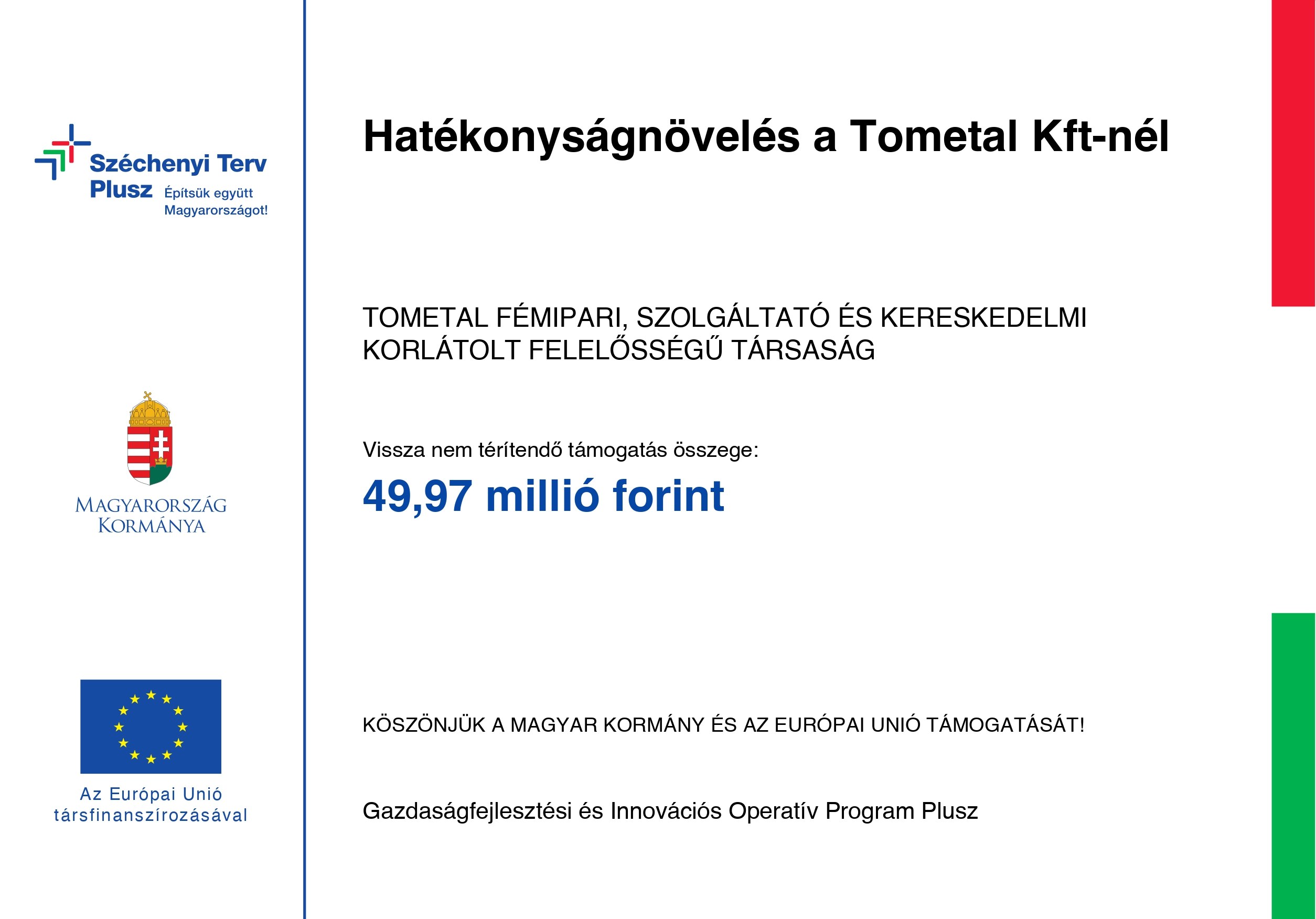 Kedvezményezett neve: TOMETAL Fémipari, Szolgáltató és Kereskedelmi Korlátolt Felelősségű Társaság